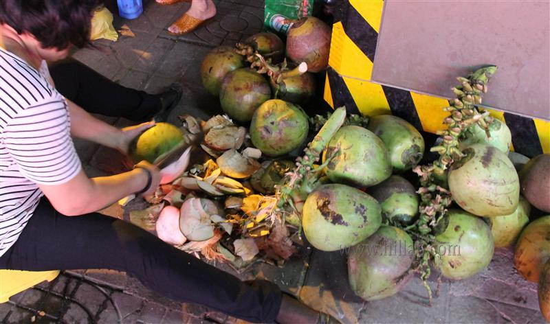 刀砍椰子,砍好了就可以喝了。