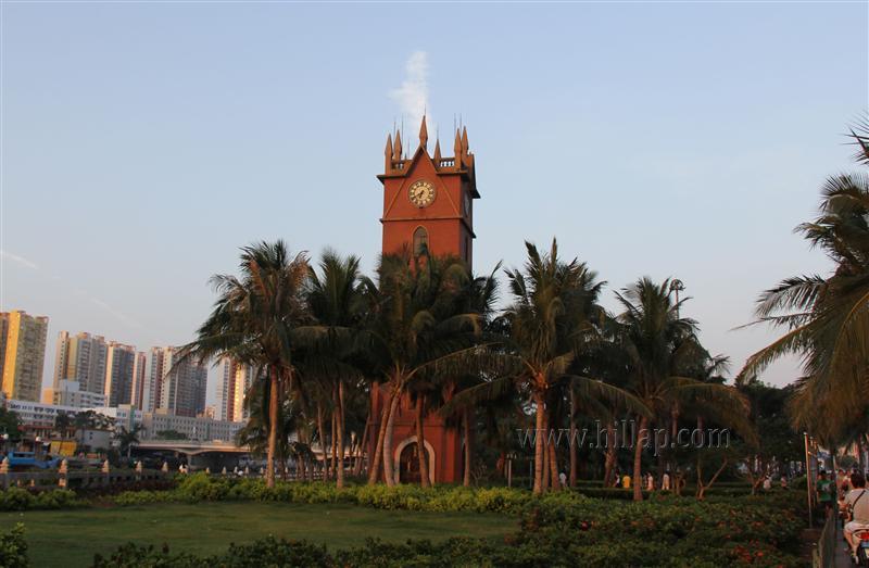 海口钟楼座落在海口市海甸河南岸,也就是长堤路的北侧,是海口市的地标之一,古色古香的。原物建于1928年,现物为1987年重修,这是缺憾之一。从照片上看,充斥了比较多的现代痕迹,不用说了,那就是海甸河北岸的房地产建筑,破坏了文物的美观。我们只能无可奈何地长叹一声,谁又有回天之力呢?