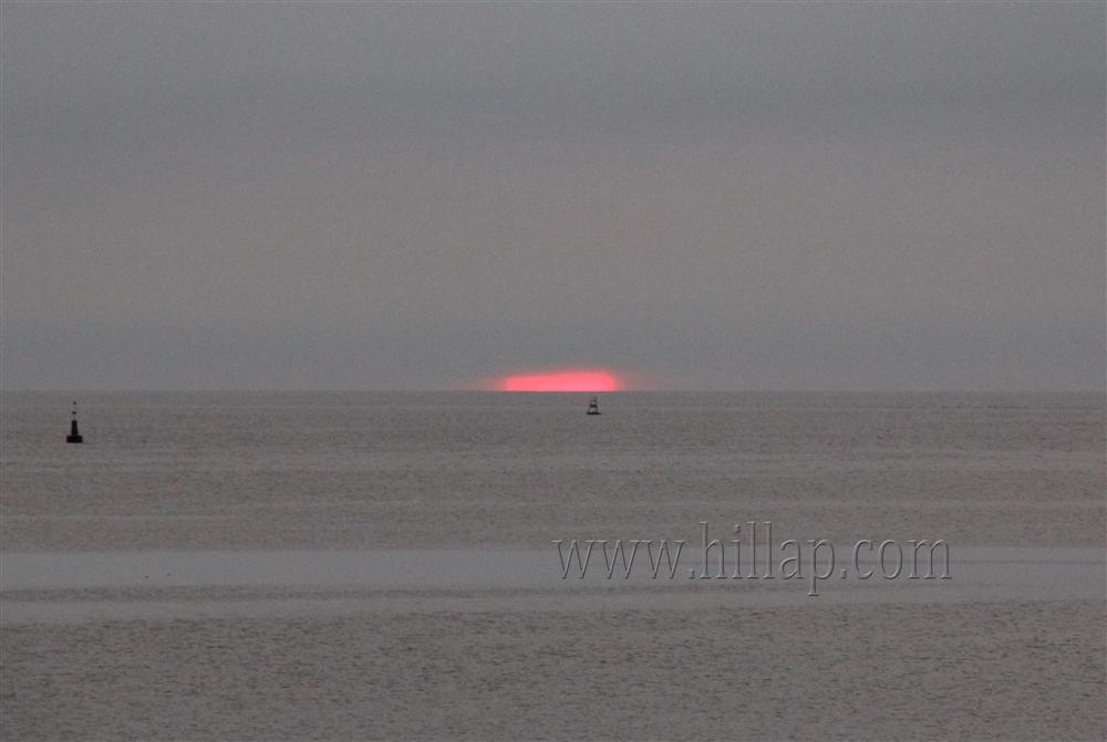2014年7月23日,下了些雨,然后傍晚雨就晴了。哎,我好久都没有背相机出去到海边溜达了,这种情况下就出动了,我知道空中的厚重的阴云有时突然会撕开一道缝,夕阳会从那道缝里露出来,那就是千载难逢的海上日落。身背相机,手拎雨伞,在浴场东端带盘旋,与一位北京来的游客闲扯了一阵子房地产,口中念“今天天公不开面没有看到日落”,同时回头望了一下西北方向,海平线上有一扁平的红色,喊了一声“太阳露出来了”,手疾眼快,端起相机就是一阵“咔嚓。那个北京的游客也拿手机对着照起来。是日落,十个人有九人都没有注意到,海平面上只撕开了一条线缝,夕阳只露出一点点脸,就象是隔着竹帘子看日落一样,只是竹帘子撑的再大一点就好了。我看到了,竹帘缝里的海上日落,我是那个看到竹帘缝里的日落的人。