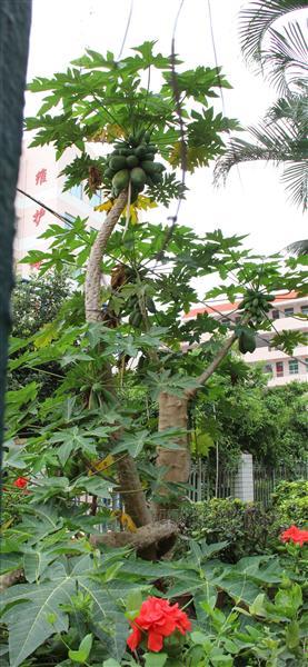 木瓜,这个就是木瓜树,在海口海关大院里拍到的。木瓜也是常见的海南热带水果了。